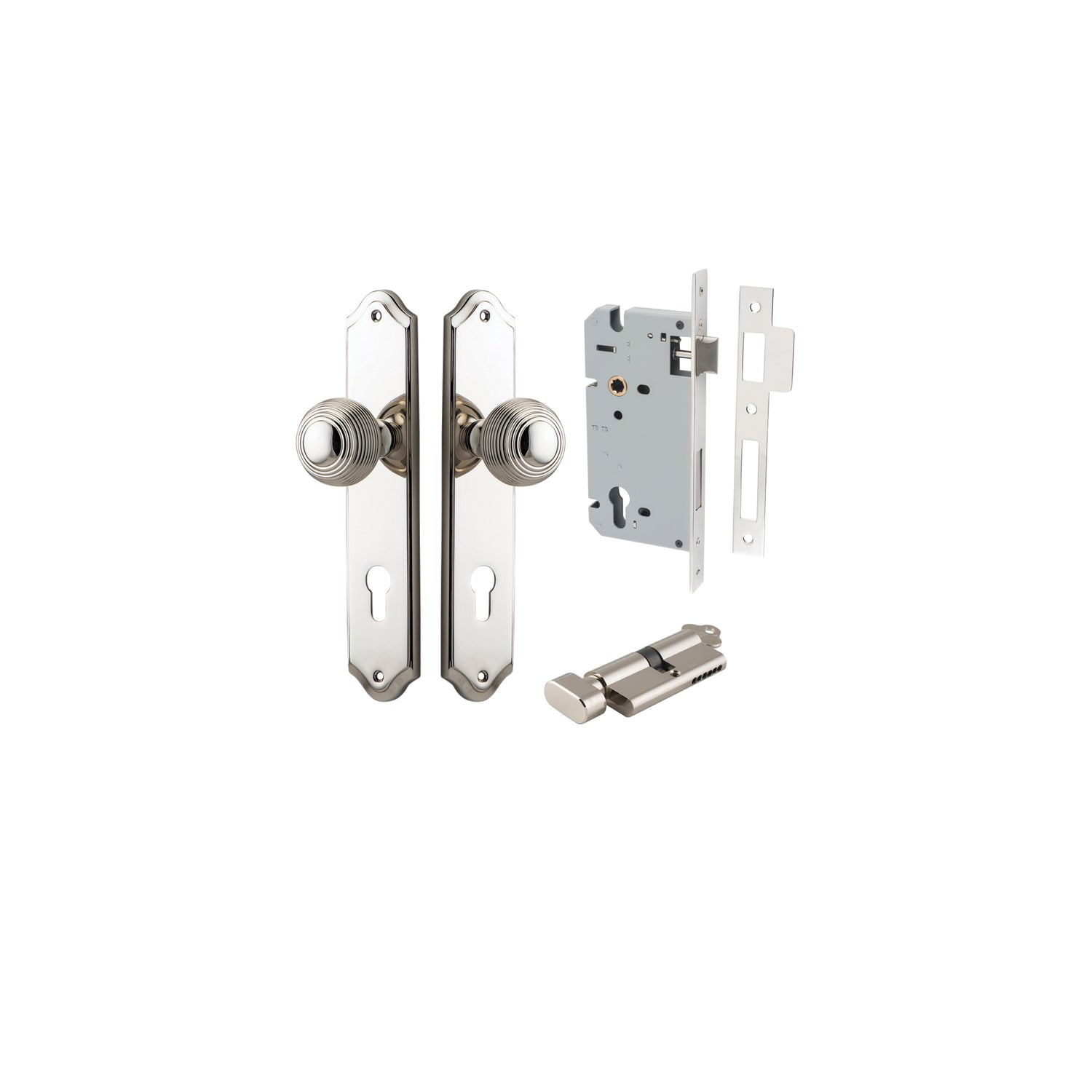 - Entrance Set, Key/Turn- Comes with 2 handles, Long body mortice lock, 2 x cylinder escutcheons (Cover plates for cylinder) & Euro Cylinder with Turnsnib on the inside
