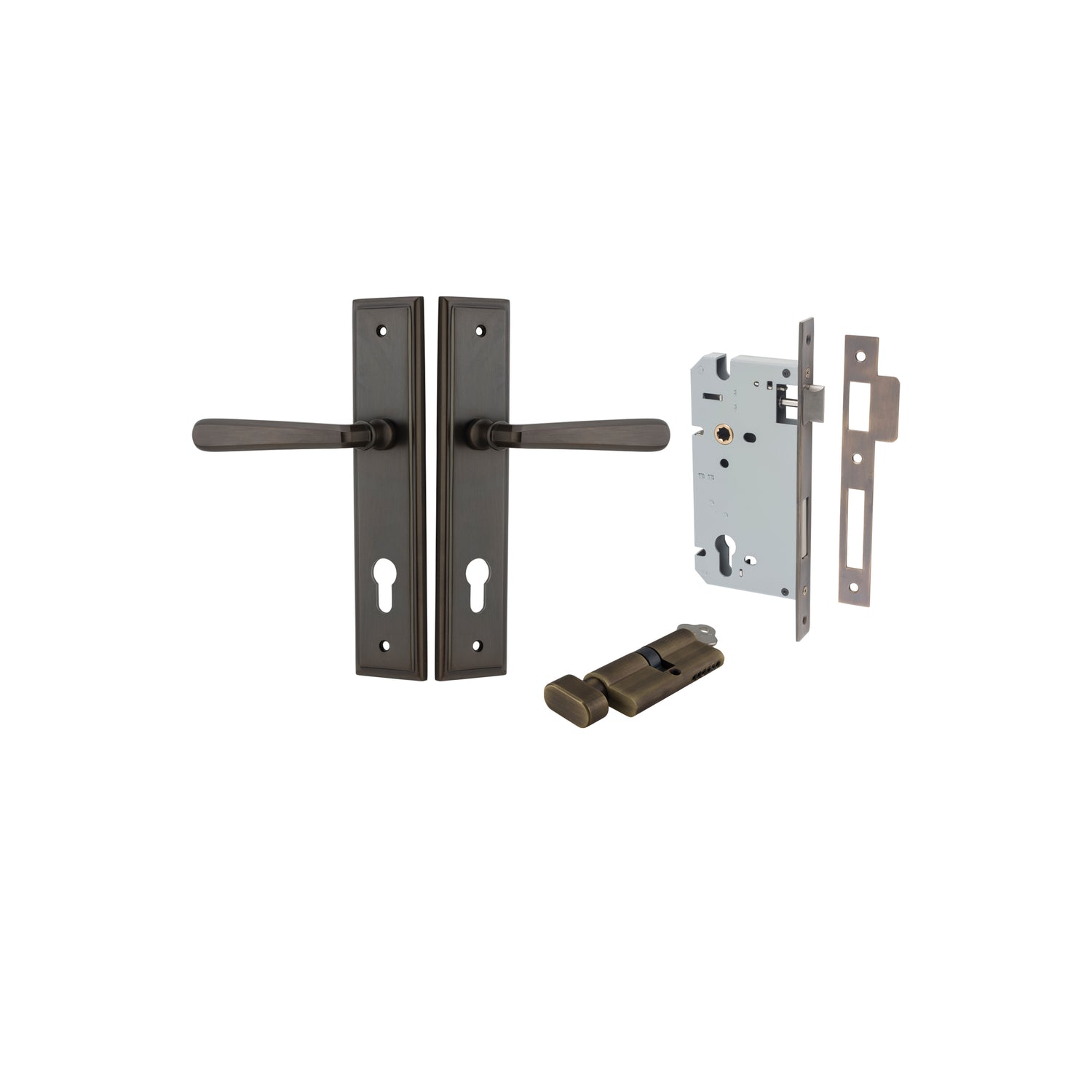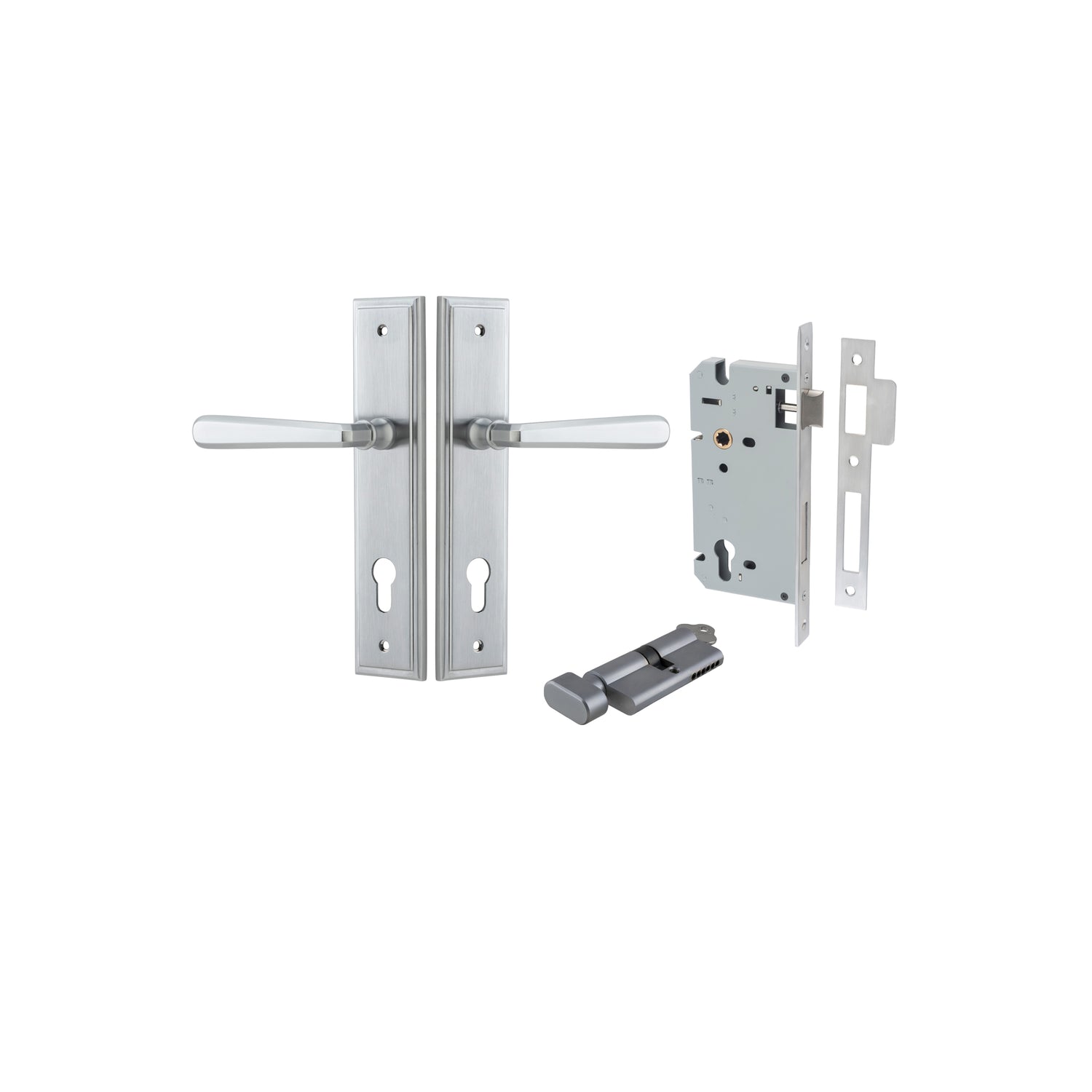 - Entrance Set, Key/Turn- Comes with 2 handles, Long body mortice lock, 2 x cylinder escutcheons (Cover plates for cylinder) & Euro Cylinder with Turnsnib on the insideĀ