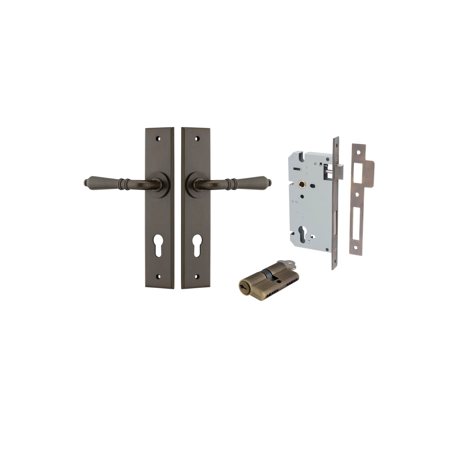 - Entrance Set, Key/Key - Comes with 2 handles, Long body mortice lock, 2 x cylinder escutcheons (Cover plates for cylinder) & Euro Cylinder key both sides for deadlocking