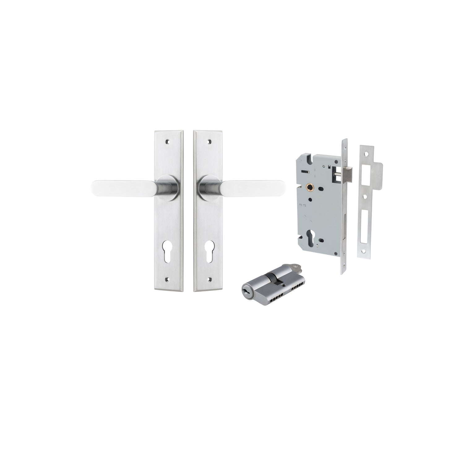 • Entrance Set, Key/Key - Comes with 2 handles, Long body mortice lock, 2 x cylinder escutcheons (Cover plates for cylinder) & Euro Cylinder key both sides for deadlocking