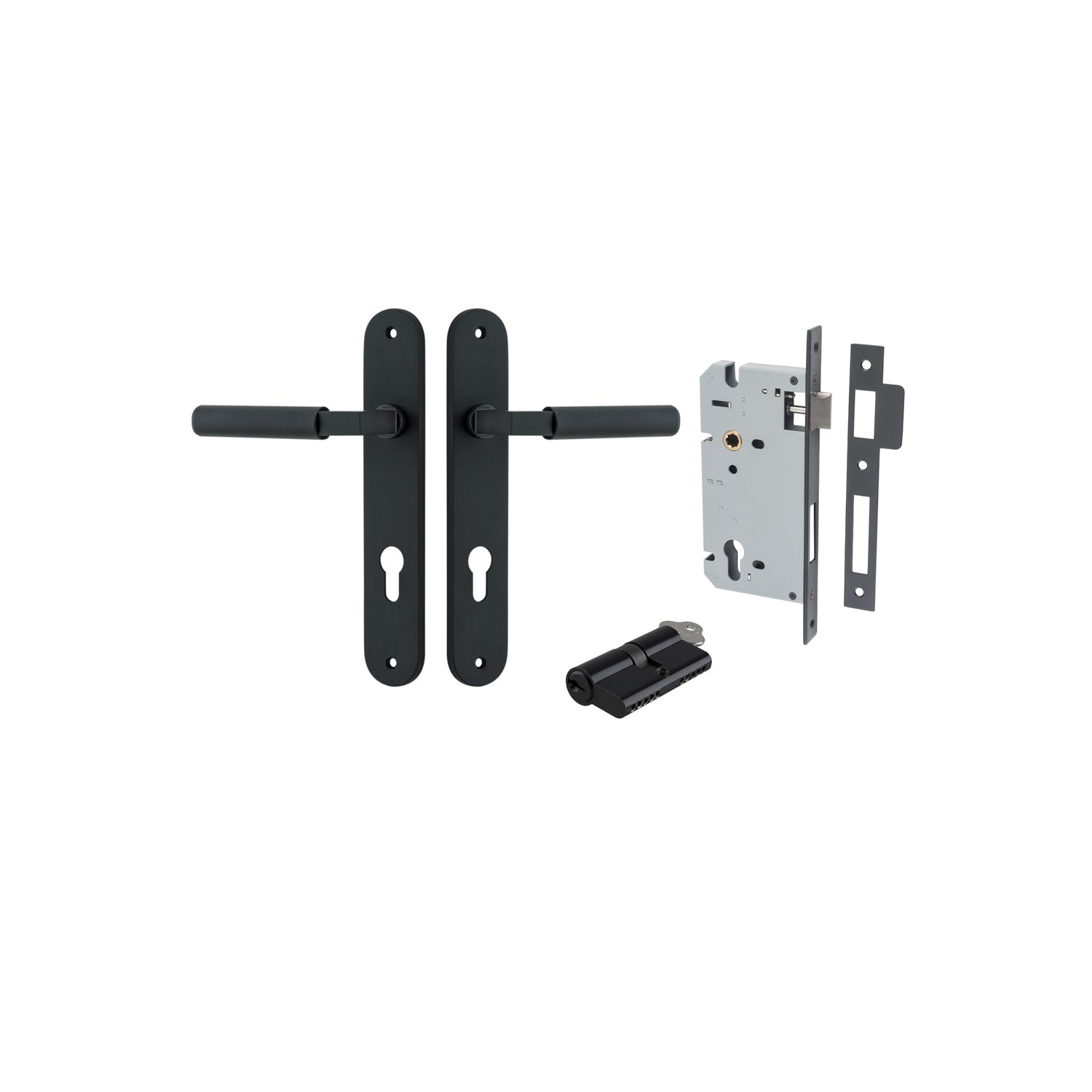 - Entrance Set, Key/Key - Comes with 2 handles, Long body mortice lock, 2 x cylinder escutcheons (Cover plates for cylinder) & Euro Cylinder key both sides for deadlocking