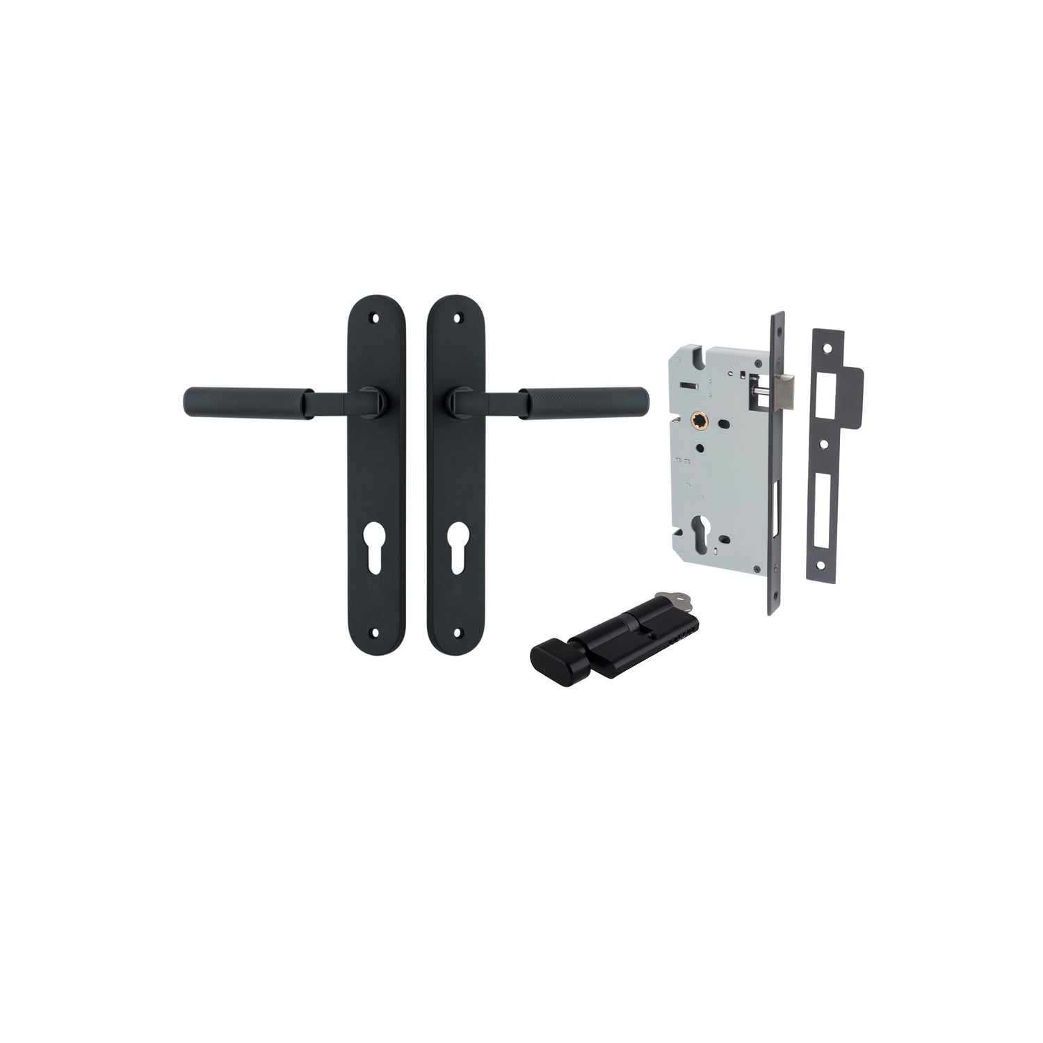 - Entrance Set, Key/Turn- Comes with 2 handles, Long body mortice lock, 2 x cylinder escutcheons (Cover plates for cylinder) & Euro Cylinder with Turnsnib on the inside